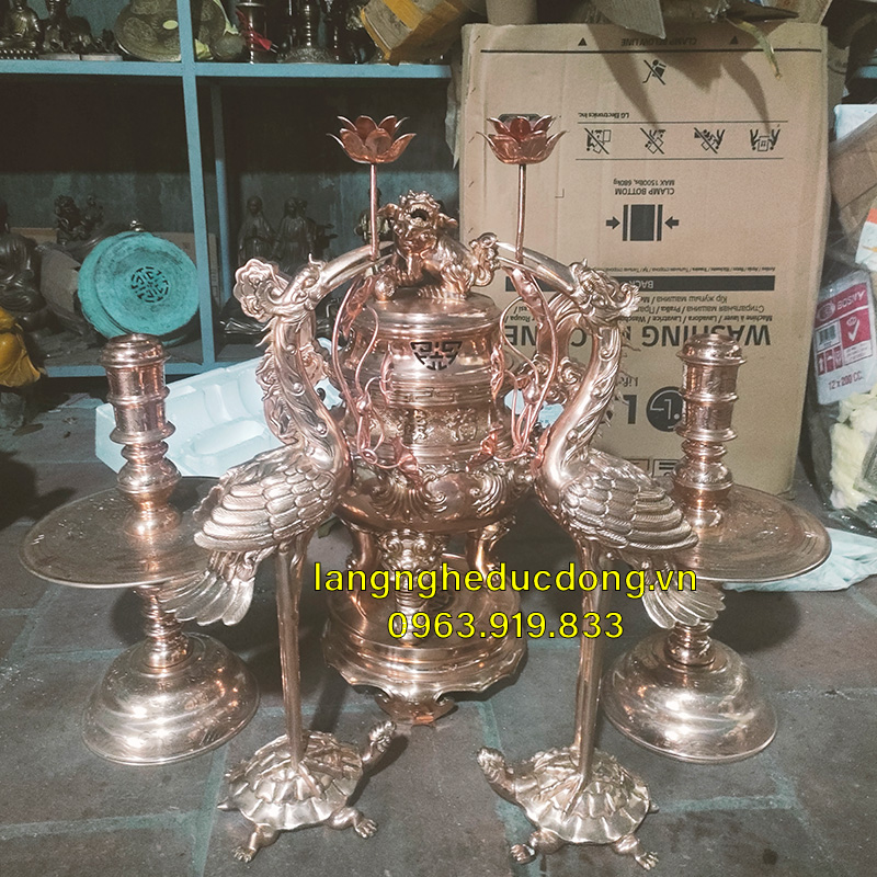 Bộ đỉnh đồng vàng cao 50cm, bộ tam sự 1 đỉnh 2 nến, mẫu đỉnh bâu cui hàng 3 khuôn