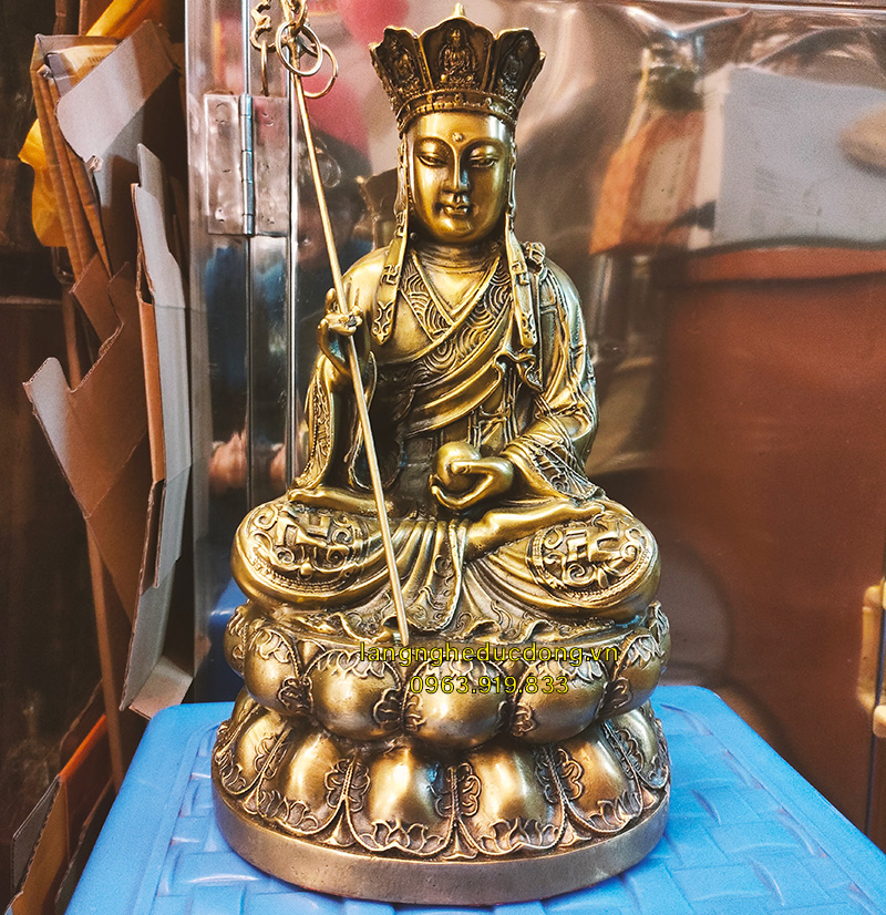Tạo hình: Ngài ngồi uy nghiêm trên tòa sen, tay cầm Tích trượng (mở cửa địa ngục) và Minh châu (soi sáng tâm hồn). Thần thái diện tượng từ bi, hỷ xả, toát lên vẻ trang nghiêm thoát tục.