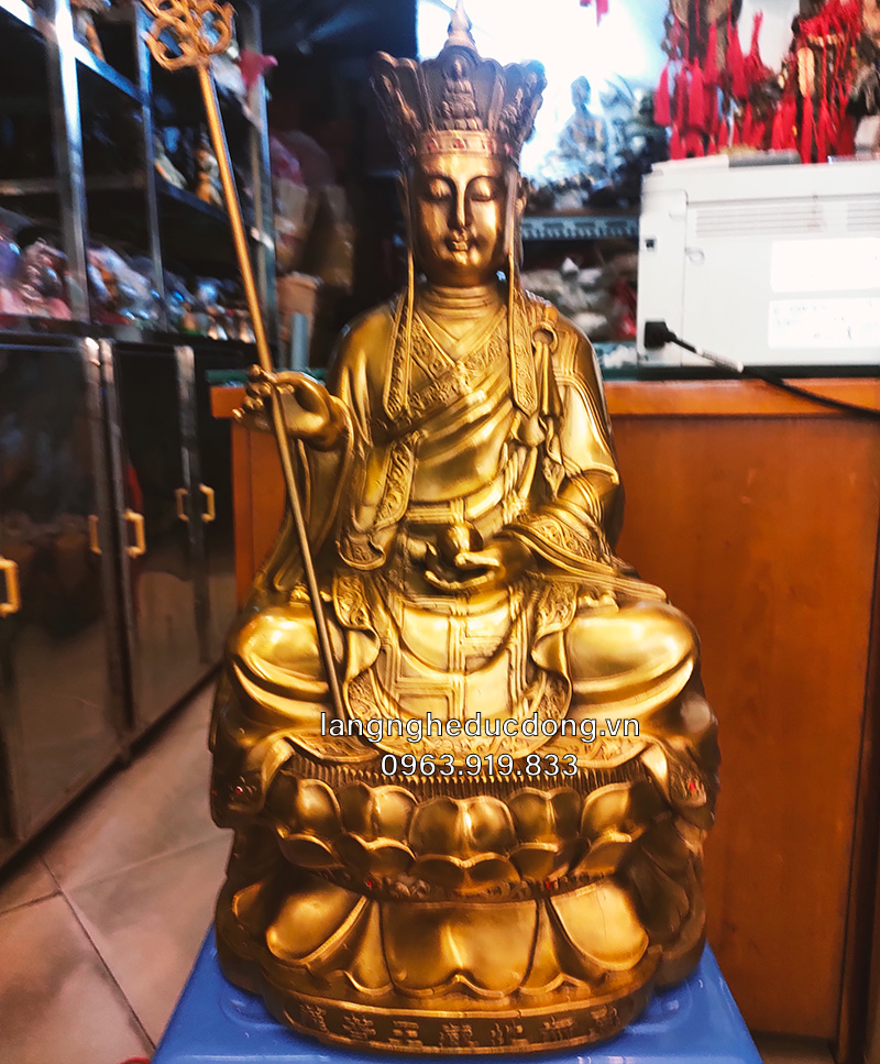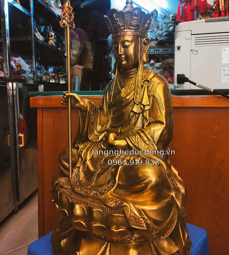 Hình dáng: Ngài ngồi uy nghiêm trên tòa sen, tay cầm Tích trượng dẹp tan cửa ngục, tay nâng Minh châu soi sáng khổ đau.